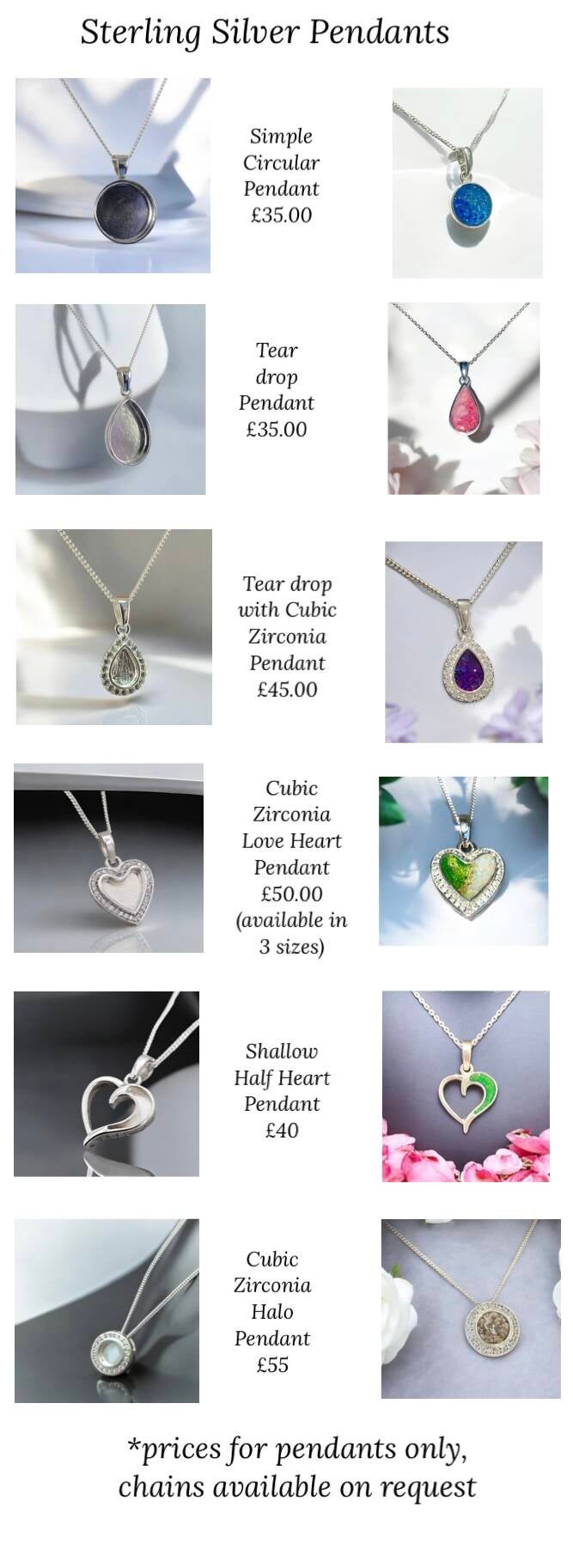 Our stunning range of pendants are a beautiful way to keep the memory of a loved one close to your heart. Our bespoke pendants can be tailored to include cremation ashes, hair, breast milk or even small keepsakes. We offer a range of designs from simple and elegant to more intricate styles, allowing you to create a piece that uniquely represents your loved one. Each pendant is meticulously crafted to ensure it becomes a meaningful keepsake for years to come.